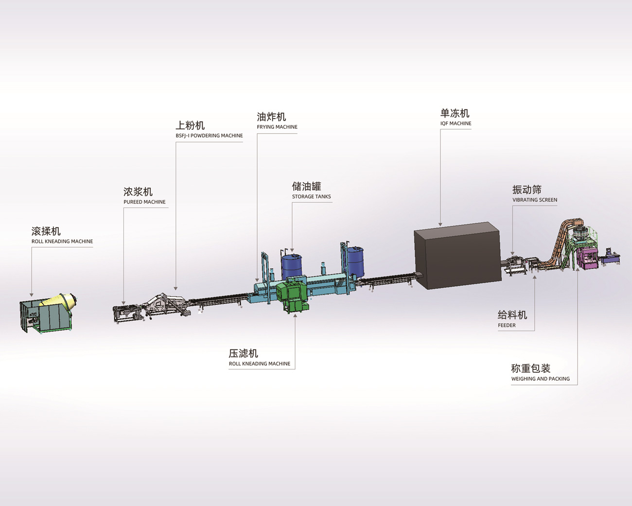 滾揉機、上漿機、上粉機、連續式油炸機、壓力式濾油機配稱重、包裝、檢重設備,適用于各類熟食、調理品企業。
